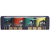 Officially licensed BBC merchandise set of 4 fine porcelain Mugs featuring a selection bold and contemporary images on a vibrant colour background. Including Tardis, Dalek and Cyberman designs.